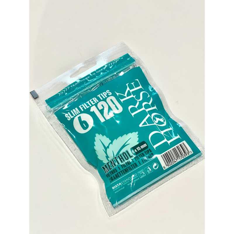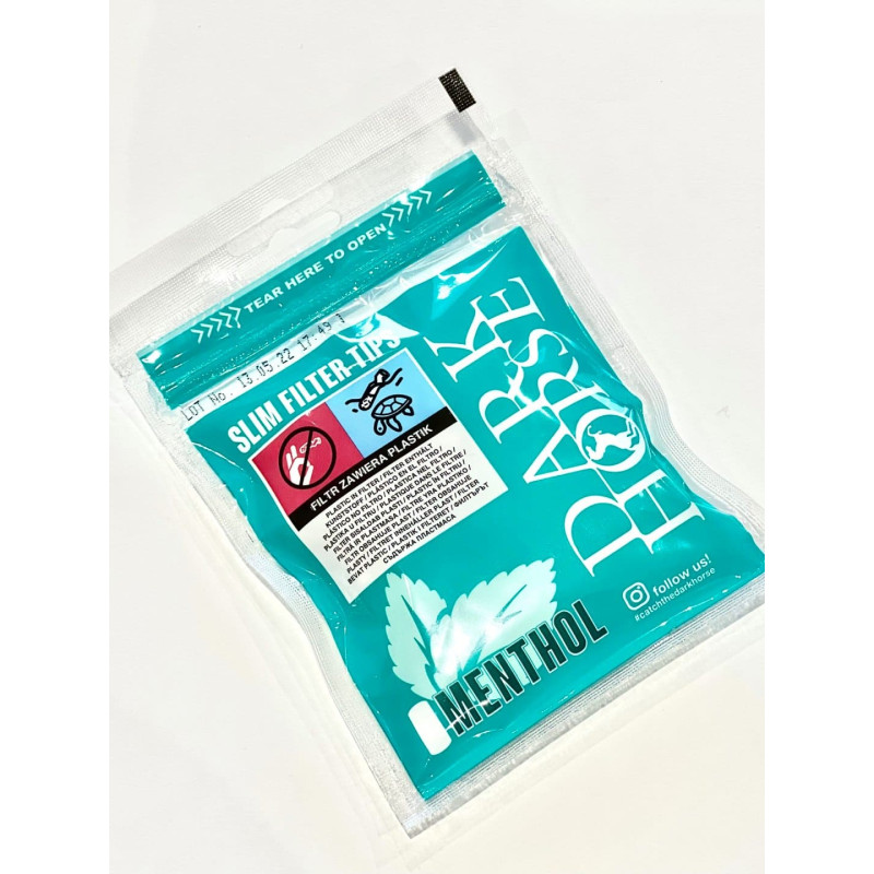 Filtry mentolowe DARK HORSE SLIM MENTHOL – idealny wybór. Te cienkie filtry octanowe mają bardzo świeży mentolowy aromat. Ponadto mają one krawędź pokrytą klejem, dzięki czemu można je łatwo zawinąć w bibułkę papierosową. Zapakowane są w szczelną torebkę, co pozwala na długotrwałe zachowanie ich świeżego smaku.