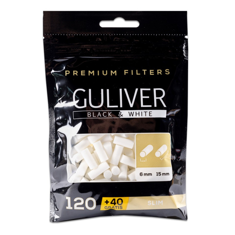 Фільтри GULIWER BLACK AND WHITE SLIM - найвищої якості фільтри для скручування сигарет як вручну так і машинками для самокруток.Фільтри виготовлені з найвищої якості сировини. Дякуючи новітнім технологіям у фільтрах GULIWER зменшено вміст дьогтю і нікотину. Гарантія найвищої та незмінної якості.