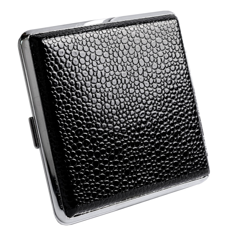 Pudełko na papierosy ORION czarne – niezbędny atrybut dla palacza, który samodzielnie skręca papierosy. Wygodne i stylowe pudełko do przechowywania papierosów skręcanych i papierosów. Wewnątrz papierośnicy znajduje się gumka, która przytrzymuje papierosy i zapobiega ich przesuwaniu się. Powierzchnia pudełka pokryta jest wysokiej jakości imitacją skóry, stylizowaną na skórę węża.